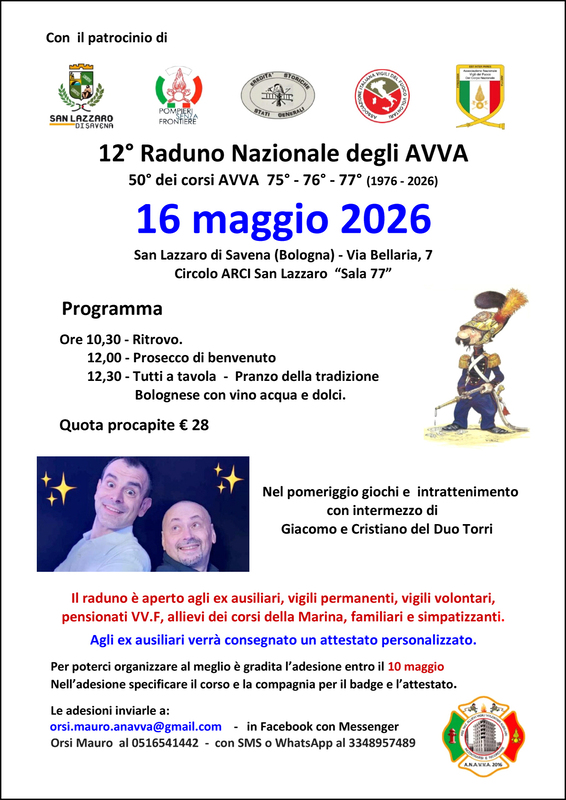 Il prossimo raduno nazionale, il 12esimo e decennale dell’ANAVVA (Ass. Naz. Allievi Vig. Vol. Ausiliari), già programmato per il 16 maggio 2026 a San Lazzaro di Savena BO