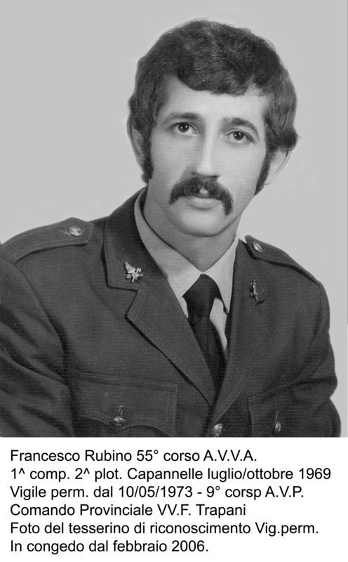 Mi chiamo Francesco Rubino, ho frequentato il 55° corso A.V.V.A. 1^ comp. 2^ plot. (Maresciallo Balistreri, Brig. Ribelli, Brig. Terracino,Vice brig. De Alfieri e Vig scelto Gubbiotti) e il mitico Prof. Enrico Massocco - periodo luglio/ottobre 1969, assegnato dopo Capannelle al Comando VV.F. di Caltanissetta e successivamente trasferito alla S.F.O di Montelibretti (dicembre/gennaio 1970) allora denominato "Centro addestramento Unità Mobili Protezione Civile" dove ho frequentato un corso di abilitazione alla conduzione per mezzi movimento terra. Nel marzo 1970 trasferito al mio Comando di residenza dove ho prestato servizio come ausiliario di partenza fino al congedo (30 ottobre 1970). Iscritto nei quadri dei Vig. discontinui (Comando VV.F. di Trapani) sono stato richiamato in servizio parecchie volte, dal 1970 al 1973 partecipando, oltre agli interventi di soccorso che tutti conosciamo, a due nubifragi di notevole entità (1971 e 1973) Il 10 maggio del 1973, vincitore del concorso a 1140 posti VV.F. venivo assunto come vigile permanente presso il mio Comando di appartenenza, dove ho fatto la prima parte del corso di addestramento che successivamente ho completato a Capannelle (9° corso Vig. perm.) con istruttore professionale C.Sq. Fortunato Lucidi. A luglio 1983 venivo promosso al ruolo di Capo squadra e operavo come da sempre con le squadre di soccorso fino al 1995, quando già scrutinato Capo Reparto, a causa di un'infarto al miocardio con conseguente intervento cardiochirurgico (triplice by-pass aorto coronarico), la Commisione Medica Ospedaliera di Palermo mi dichiarava inidoneo permanentemente per il servizio operativo e idoneo per quello amministrativo. In conseguenza di ciò ero costretto (mio malgrado) a transitare nel supporto tecnico amministrativo, con conseguenze anche economiche, poichè all'epoca non vigeva l'art. 18 che consente, pur non essendo più operativi, di permanere con il grado e la qualifica nel ruolo di appartenenza e impiegato in servizi alternativi. Da allora mi veniva attribuita la qualifica di Assistente amministrativo e all'ufficio automezzi mi occupavo di tutto ciò che era inerente la manutenzione dei mezzi stessi e del materiale tecnico, con l'onere di tenere sempre in efficienza i mezzi della Centrale, dei 4 distaccamenti terrestri, 2 aeroportuali e 1 portuale, il tutto supportato anche dalla mia esperienza professionale in quanto da civile ero meccanico di mezzi pesanti. Sono andato avanti così per altri dieci anni e nel febbraio 2006 con qualifica di Assisitente Amm.capo sono andato in pensione. Nonostante tutto, ad onor del vero, mi sono dovuto adattare al nuovo ruolo sia per il tipo di lavoro che mi era stato assegnato che per gli orari giornalieri e non più da turnista, e non per ultimo il lavoro/missione di vigile del fuoco che avevo fatto per tanti anni con la gratificazione (per chi ci crede) che questo lavoro atipico può dare. Sono pienamente orgoglioso di aver fatto parte del C.N.VV.F. di questa "Grande Famiglia" e di aver dato in tutti questi anni la mia gioventù e il meglio di me stesso. Adesso, da pensionato, ho lasciato il testimone ai miei due figli i quali sono : - uno in servizio al Comando Prov. VV.F. di Milano e uno, al momento in cui sto scrivendo, alle S.C.A di Capannelle frequentante l'ottantatreesimo corso Alllievi Vigili Permanenti. Infine, un ringraziamento/plauso ai fondatori e sostenitori di questo meraviglioso sito, e per l'opportunità offerta per far rivivere a persone come me ricordi e momenti unici di un vissuto difficile da dimenticare. Francesco Rubino.